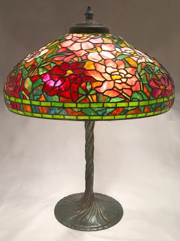 With its large, showy blooms, the peony has over 40 varieties whose flowers vary from a single row of petals to deeply ruffled blossoms. Known in Eastern cultures as “the flower of riches and honor”, the peony is a favorite Tiffany floral motif. Peony flowers come in a variety of colors giving the lamp artist free reign to showcase spectacular flower glass. This richly toned 22″ Peony shade was created as a showroom piece in 2011 and is now in a private local collection. The rich amber background gives a backdrop of sunny warmth to the richly colored flowers that cover the shade. The shade is shown on the beautifully detailed Twisted Vine base (24.5″ tall).