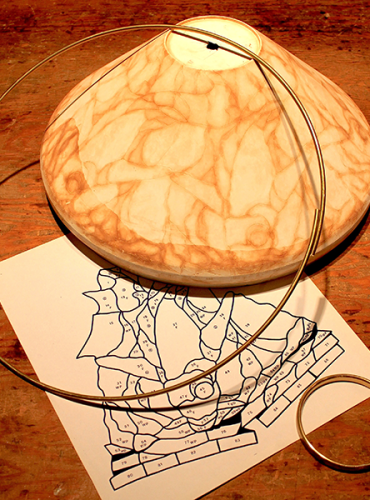 Once the outside of the shade is soldered and the upper ring is installed, the fiberglass form is warmed, the wax melts and the shade is removed from the form. Shades which have an undercut are removed in two pieces along a lead line that has not been soldered together. The lower portion of the shade is then reattached to the upper. Soldering continues on the inside of the shade until every lead line is finished. Larger shades will be reinforced with copper wires soldered in place inside the shade, conforming to the path of the lead lines. These reinforcing wires are not seen when the lamp is finished, but provide additional stability to larger pieces.