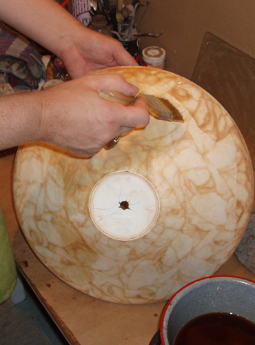 Once the patination is complete, the patina on the lead lines needs to be sealed. The surface of the entire shade is covered with a thin lacquer and the shade can then be waxed to further tone the patina if desired. Tiffany Studios used many different lacquers during their years of lamp construction. The finished shade is then brought together with the lamp base to complete the lamp.