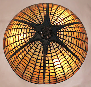 Depending on the glass chosen for the shade, the 15″ Spider shade has the ability to look bright and cheerful or dark and menacing. While obviously inspired by a spider and web, Tiffany Studios originally referred to the shade as “geometric plain, heavy ribs for #337 base”. The #337 base is the Mushroom base shown in the photo and is a perfect mate for this shade. It is not surprising that original examples of this shade are rarely matched with a different base since it is called out this way on their price guide.