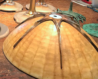 We shot a short video of Irwin Terry soldering the spider legs into the shade. When incorporating cast bronze parts (spider legs, wisteria crowns, etc) into a shade, the challenge is to keep the metal hot enough that the solder will flow and attach to the glass. Irwin uses two soldering irons when attaching rings, rims and cast parts because until the thick metal parts heat up, they suck the heat out of the iron. Working with two irons, the metal parts heat up quickly and the irons stay at temp.