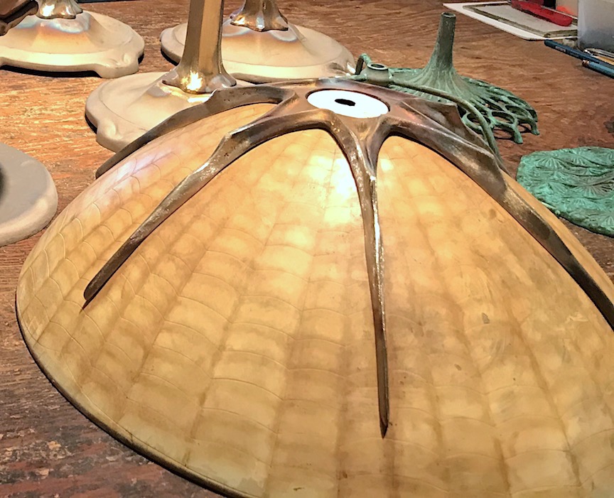The spider legs, or heavy ribs as they are referred to in the original price guide, are cast in bronze and give the shade an additional three dimensional quality not found with traditional dome shades. Even the vent cap is an abstract representation of the spider’s body. For this shade, our client requested a light amber tone and the glass we chose is a transparent white and amber/yellow mix that has wispy mottles. The shade was commissioned by a client in Ohio and is mated on the traditional Mushroom base (16″ tall).