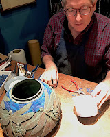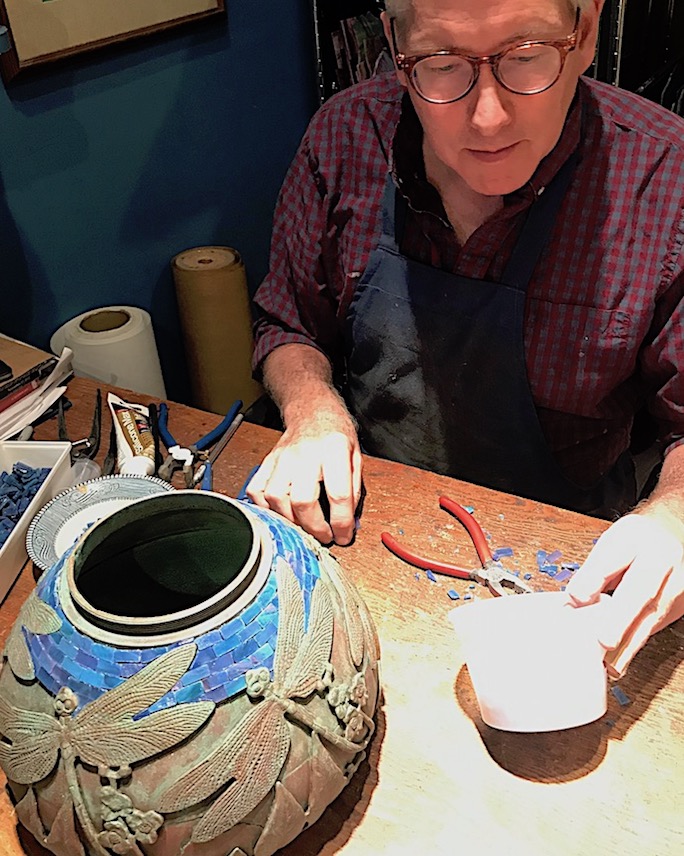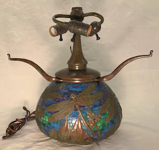 The shade is shown on the elaborate Dragonfly Mosaic Urn base. The rounded shape of the base is decorated with sculpted dragonflies and flowering water plants in relief. The glass mosaic was painstakingly hand cut, fit, and applied to the base by Bill Campbell. Once applied, the mosaic has been completed by grouting the surface, after which the the patina was finished and the base wired and assembled. It should be noted that each time we create a mosaic base, the result will be unique combination of glass colors.