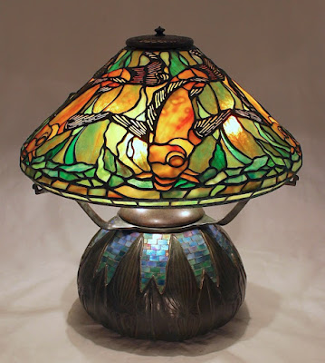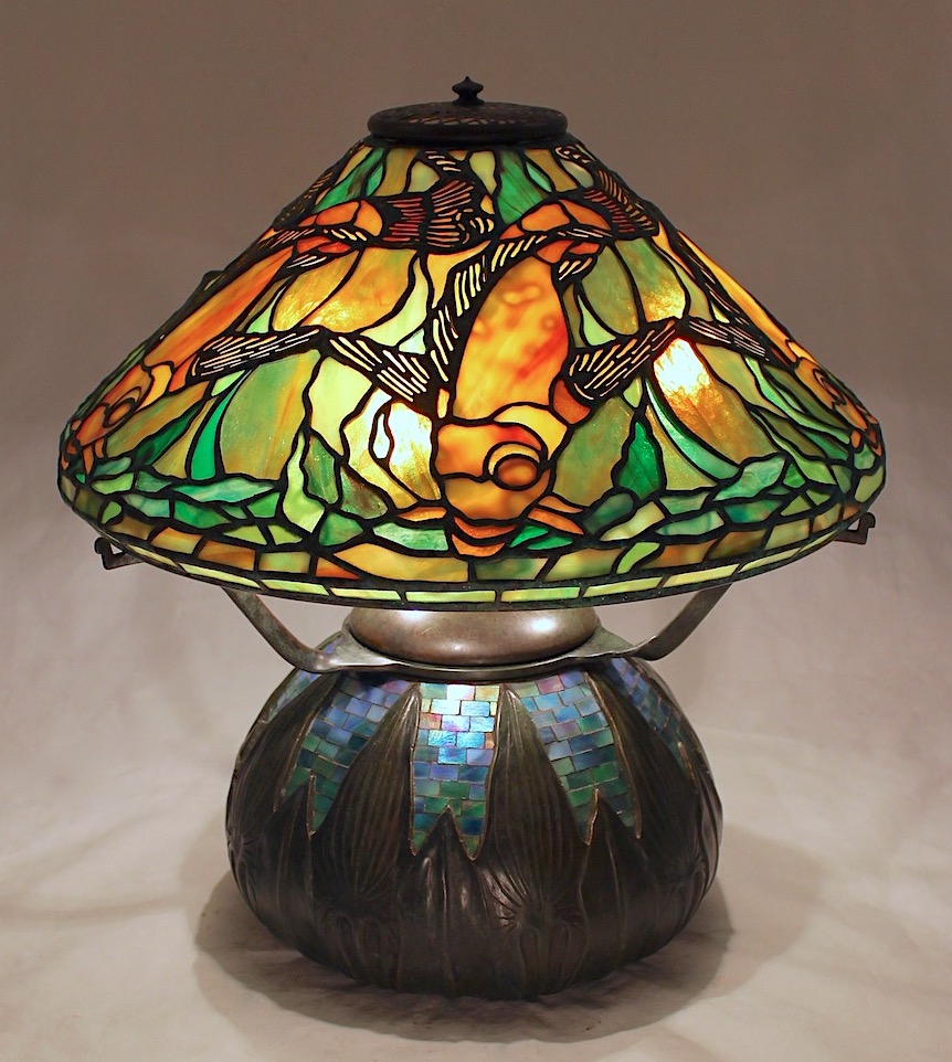We recently completed this 16″ Fish shade for a client in New Jersey. Five Koi fish gently wrap around the shade amongst water plants in a rhythmic dance. The fins of the fish are accentuated with metal filigree overlays. The color palette for this shade is a gentle mix of yellow/amber, orange, and green.