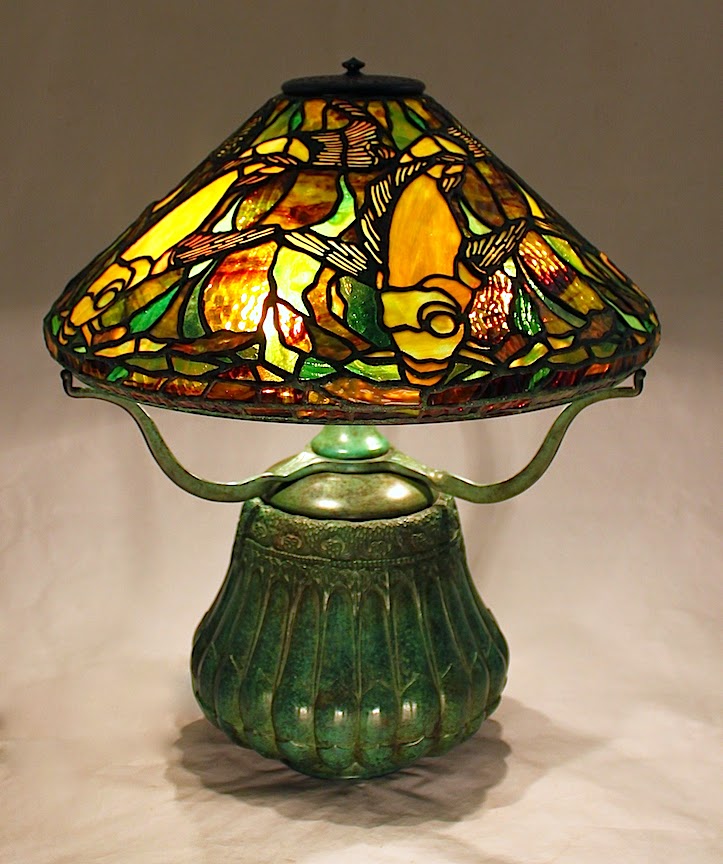 The 16″ Fish shade is one of our favorite Tiffany Studios shade designs. The shade shows a school of five Koi gently swimming in a pond, weaving amongst plant life. With their elegant swirling bodies and filigreed fins and tails, the fish form a rhythmic design across the surface of the shade. In many cultures, Koi symbolize good fortune, success, and prosperity. Koi come in different colors, each with its own meaning. Yamabuki, or Golden Koi symbolize riches, wealth and prosperity. We have created this lamp for our showroom and it is currently available for purchase in our studio.
