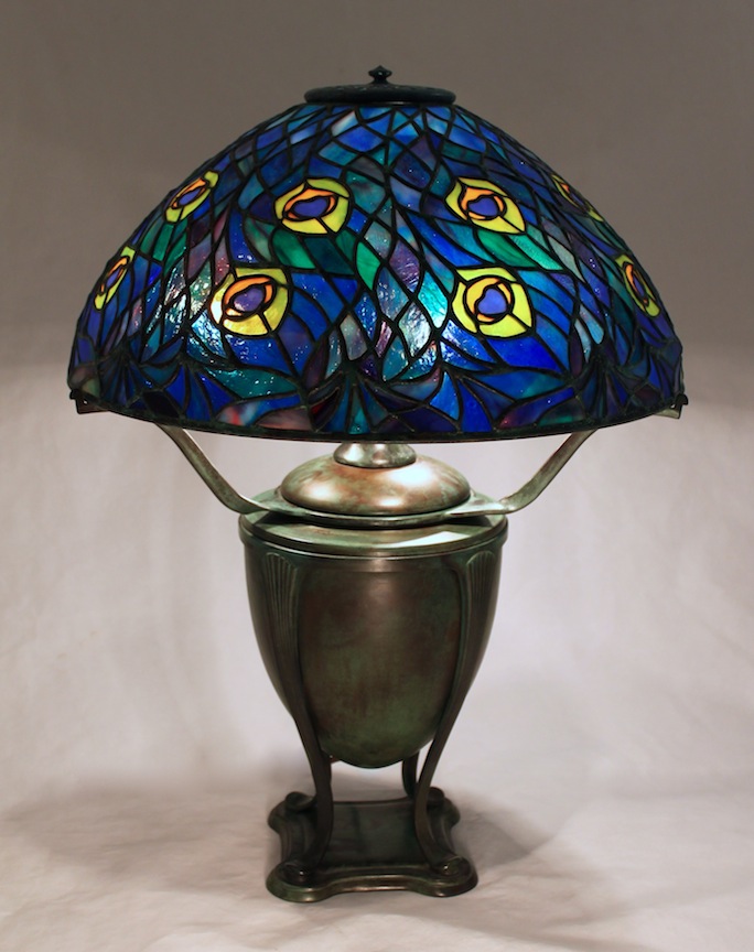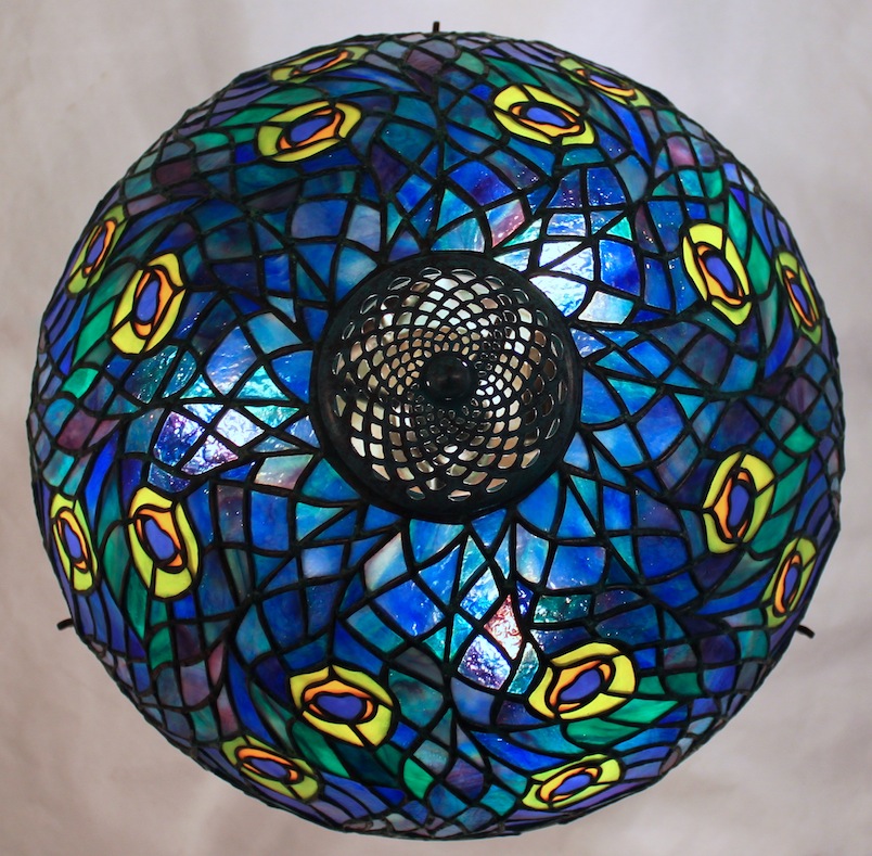 With their showy multicolored feathers, peacocks are a natural inspiration for stained glass. Tiffany Studios created about a half a dozen peacock inspired lamp shades, and the 16″ Peacock shade is still one of our favorites. Composed of eight pairs of swirling tail feathers, the design has a flurry of movement and opportunities to blend colors.