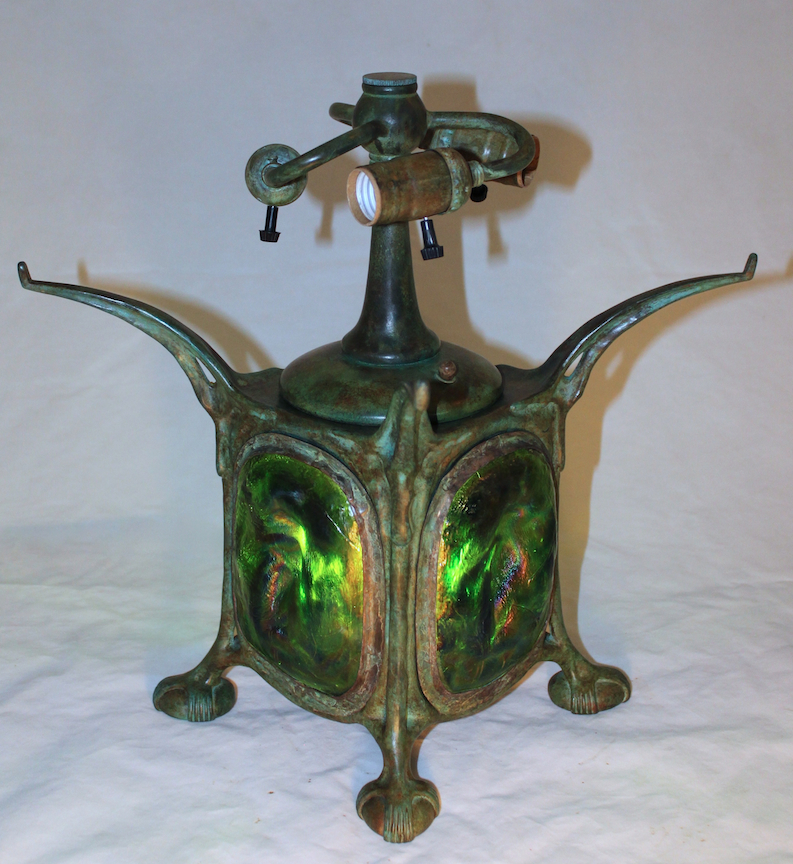 The four sided bronze base was created at our studio using molds taken from an original Tiffany Studios example and is illuminated from within. We used the same green turtleback tiles in both the shade and base.