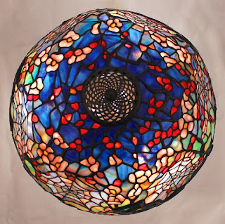 While the Wheat Mosaic base was commissioned by a client in Pennsylvania to be used with a shade the client was making themselves, the 18″ Cobweb shade was created for a client in Florida for use on their existing Wheat Mosaic base. The 18″ Cobweb shade is unusual in several respects. The shade is faceted with six flattened areas, each containing a large spider web intermingled in the branches of an apple tree in blossom. A single industrious spider can be found hidden within one of the webs on the shade. Each component part of the lamp arrived and was joined with their respective counterparts.