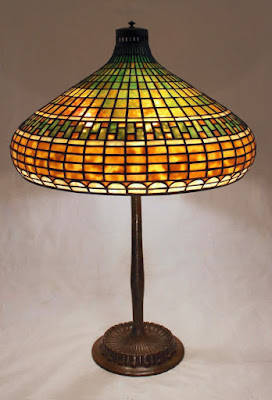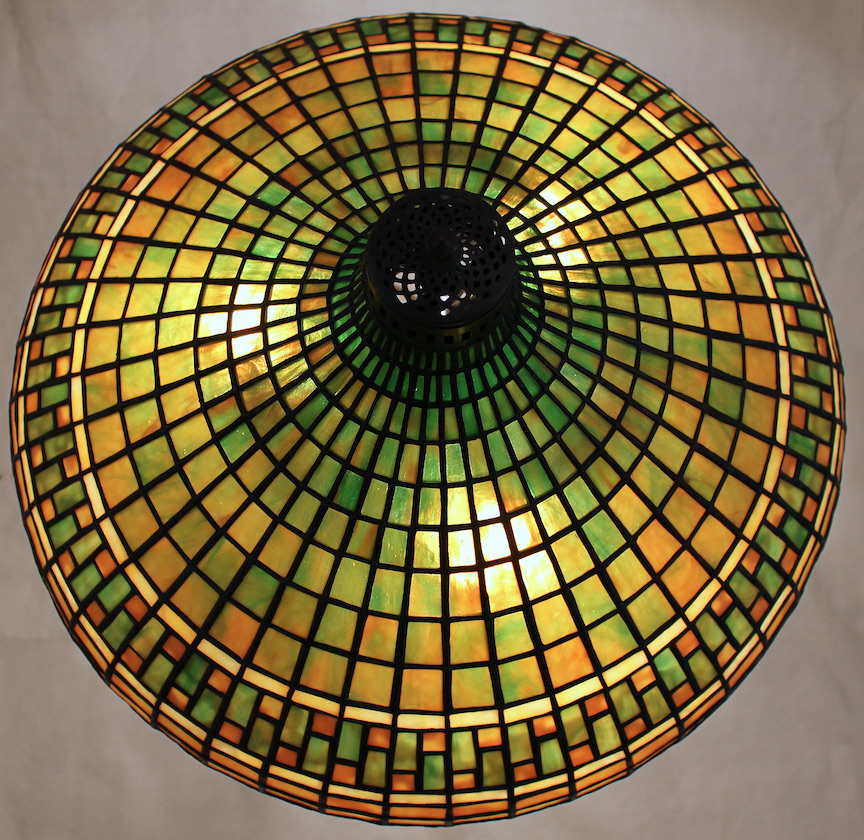 Tiffany Studios created a plethora of geometric shade designs in all shapes and sizes. The 18″ Geometric Moorish shade has a unique onion dome profile and which is accentuated by the addition of a wide pierced metal band at the top of the shade. The geometric tiles are horizontally bisected by a decorative border row. To ground the design, the two border rows at the bottom have an arch motif.