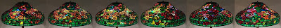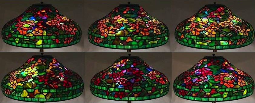 In preparation for our annual Arts & Crafts Show last weekend, we created a lively 18″ Nasturtium shade. Bursting with energy and showcasing glass from every major glass maker of the past 30 years, the shade was carefully blended to change color depending on which side of the shade is viewed.