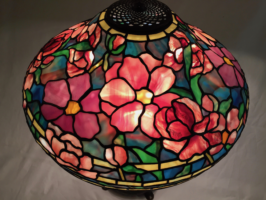 We were commissioned by a client in Georgia to create this colorful 18″ Peony shade. The flowers for this shade are a lush gold pink – meaning that gold is required to create the fuchsia color in the glass. The flowers are set against a summery blue sky, tinged with pink and green that blends both the leaf and flower colors into the background.