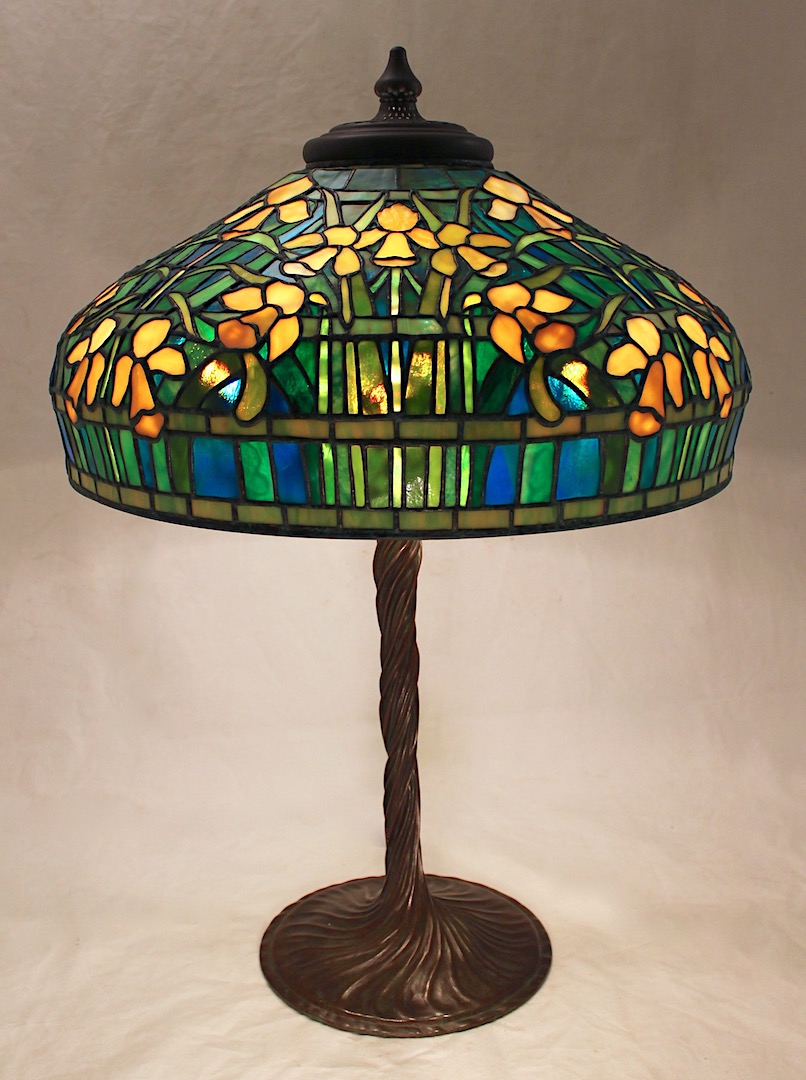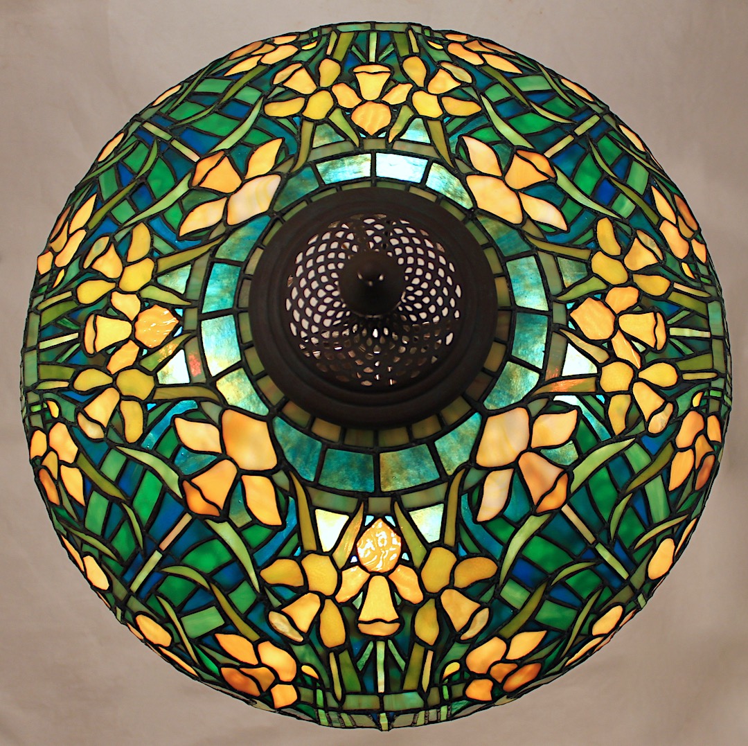 The 20″ Daffodil Turban is a generously proportioned 20″ shade that can be used as a table lamp, chandelier fixture, or on a Jr. Floor base. The strong upward thrust of the leaves and stems plays against the multiple horizontal border rows. This symmetry is playfully disrupted by daffodil flowers in full bloom poking between and spilling over the borders.