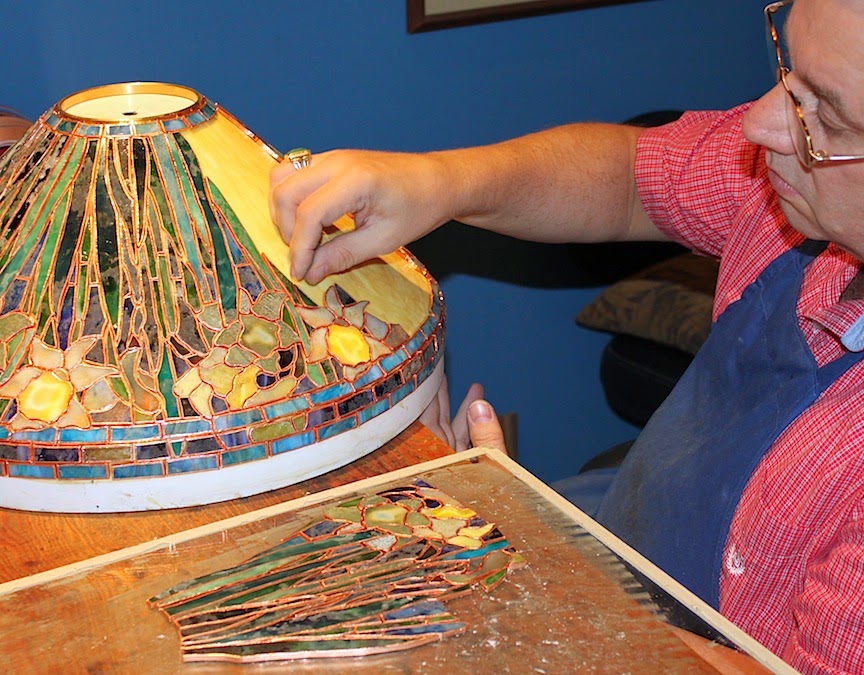 he foiled pieces of glass are being transferred onto the waxed lamp form by Irwin. Once the pieces were in place, the shade was ready for soldering and finishing.