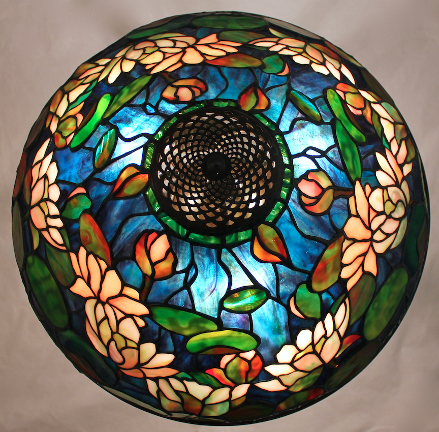 Tiffany Studios often used water themes for lamps and windows, and one of their most popular shade patterns is the 20″ Waterlily. Lily pads float on the surface of a tranquil summer pond while flowers and buds playfully interact across the shade. For this shade, the water glass is a brilliant shining blue tinged with deep purple. Set against this shimmering backdrop are white flowers blushed with pink and red. Lively green tones enliven the pads while an emerald green rippled glass border plays off the deeper color tones towards the bottom of the shade. The shade is shown on the intricately detailed Cattail base. This lamp was commissioned by a California client.