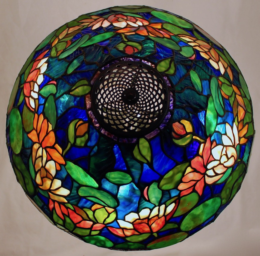 The 20″ Waterlily is one of our most popular reproduction Tiffany shade designs. The shade makes an impressive table lamp and is perfect as a chandelier fixture.