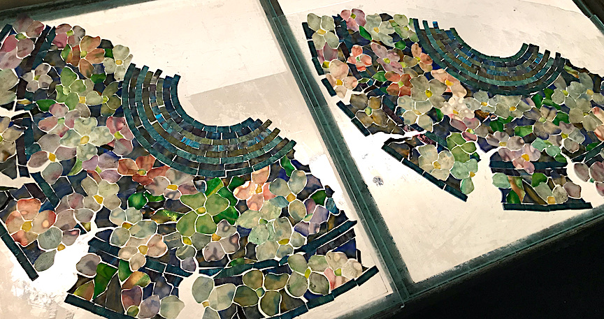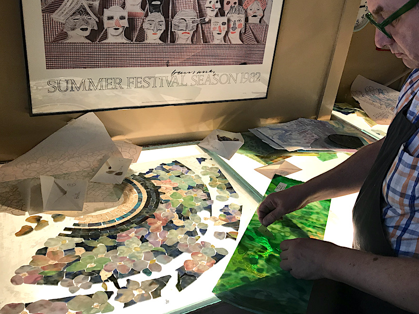 Irwin Terry has been choosing the glass for this shade. Each flower has been carefully considered and laid out in a variety of whites mixed with pinks, greens, purples, and blues. In the photo above, the background and flowers have been completed and Irwin is choosing glass for some of the leaves. On most shades we choose the border rows after the other elements of the shade have been laid out to compliment the colors of the shade.