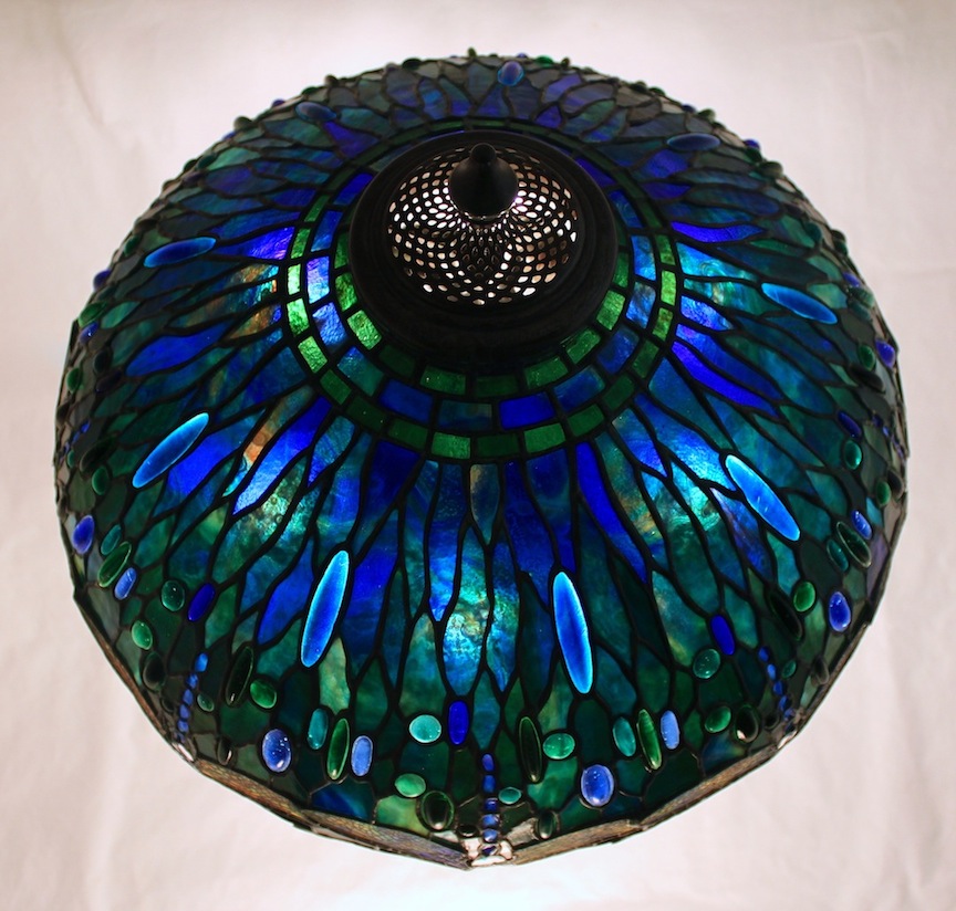 It is always exciting to create a 22″ Dragonfly shade. The endless variety of color combinations available for this design make each example fresh. The generously sized shade is studded with pressed glass jewels, which provides additional color accents and sparkle to the finished lamp. The deep blue and green background for this shade was created using Lins glass. The Lins Glass Foundry went out of business in the late 1990’s and we recently acquired this glass as part of a small private stash of sheet glass. Commissioned by a California client, the shade is shown on the Perforated base. This base has six lights and can be telescoped to be taller.