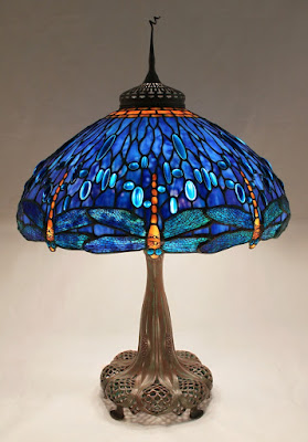 We are often asked to create matching pairs of lamps, and this set of 22″ Dragonfly shades was commissioned by a client in Australia. The rich blue background glass is studded with medium blue glass “jewels”. Amber bodied dragonflies create the irregular lower edge of the shades. One of the shades is shown on the Perforated base.