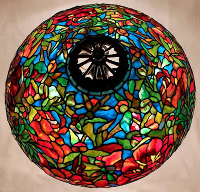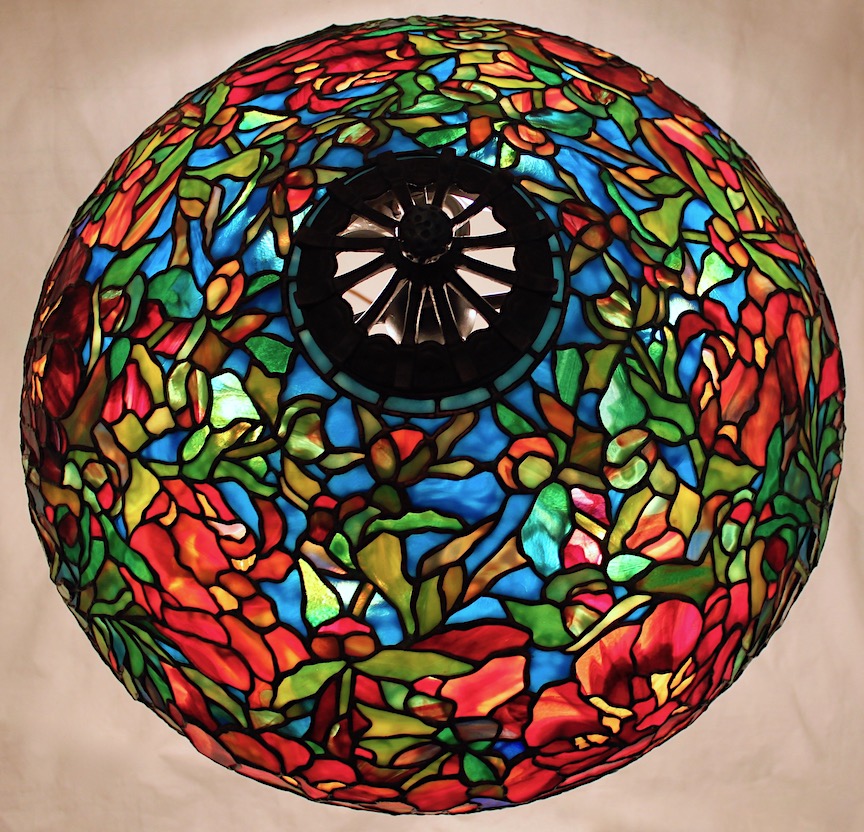 The design of this impressive shade clusters the flowers with intricate foliage bridging the space between the blooms. The impressionistic use of color throughout the shade enhances the complexity of the design. The shade was commissioned by a client in Illinois.