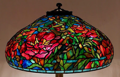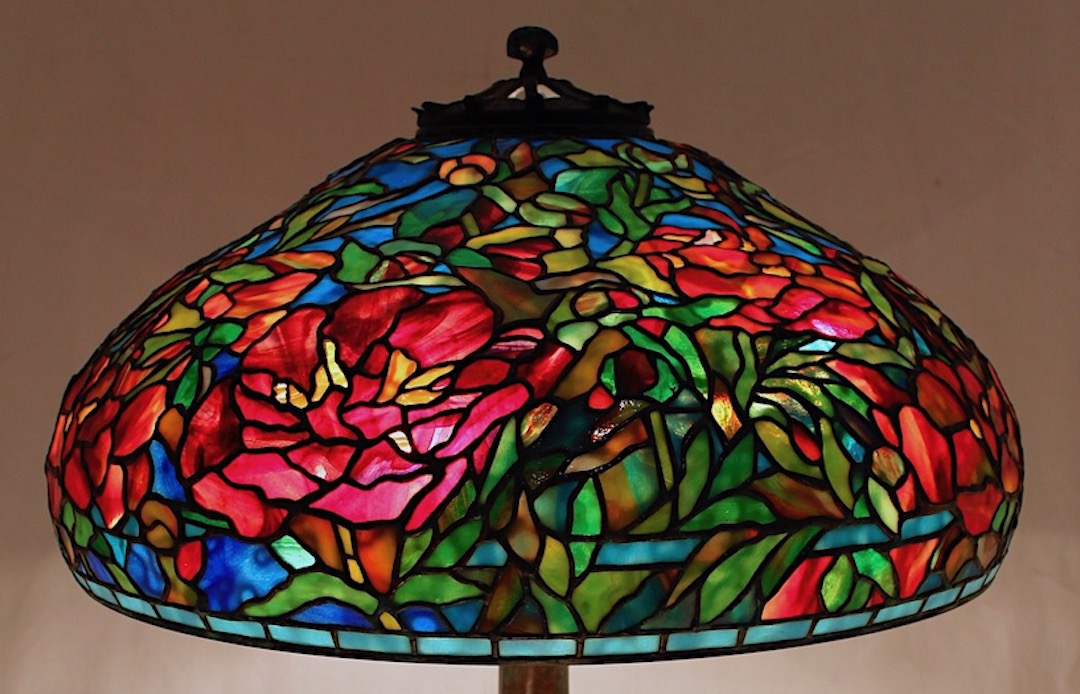 We have completed the 22″ Elaborate (or Windswept) Peony shade. Shown on the impressive Large Bamboo Table Base (27″ tall), this generously proportioned Tiffany Studios shade design is known for its intricate piecework and stunning depiction of peonies in full bloom.
