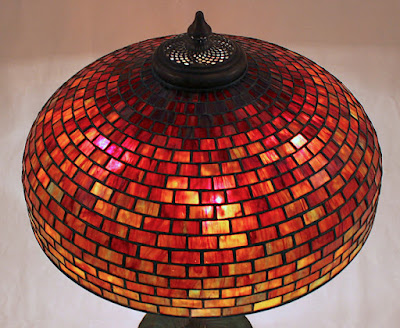 The 22″ Geometric shade is a large, impressive shade that can be created in any coloration. For this piece, we began with a deep red at the top and gently shifted the color to a rich amber tone at the bottom. The brickwork positioning of the glass tiles gives the shade a stable appearance. This lamp was commissioned by a local client and is shown on the Twisted Vine base (lamp height 27″ tall). The shade also works well as a floor lamp or chandelier fixture.