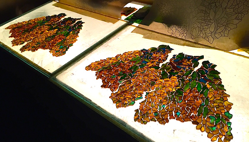 With just under 2000 individual pieces of glass, the 22″ Laburnum shade is one of the most time consuming shades we create. Each piece of glass in this complex pattern is individually laid out, hand cut, and precisely fit to the pattern. Two thirds of the shade are shown on the light table, where we double check our glass selection before assembling the shade.