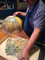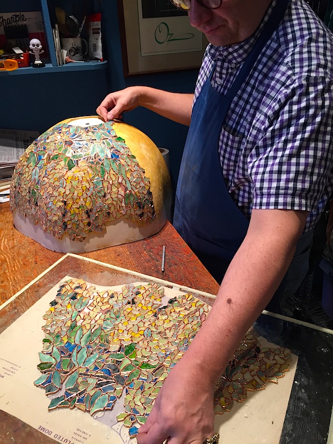 The outside edge of each piece of glass gets individually wrapped with a thin copper foil. The foiled pieces are then transferred onto the three dimensional form and are held in place with our house made tacky beeswax. Once each piece has been fit onto the form, we begin soldering the shade. Once the exterior has been completely soldered, the form is heated so the wax will melt and release the shade from the form.