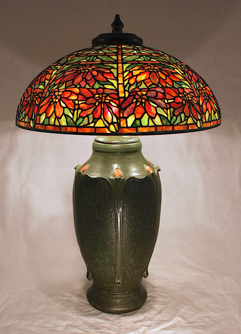 Our client commissioned this shade to be used on an original Tiffany Studios lamp base in his collection. We are showing the shade on the Twisted Vine base (24.5″ tall) and on a unique Monumental Pottery Leaf & Bud Urn base (29″ tall). This one of a kind pottery base is currently available for purchase.