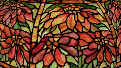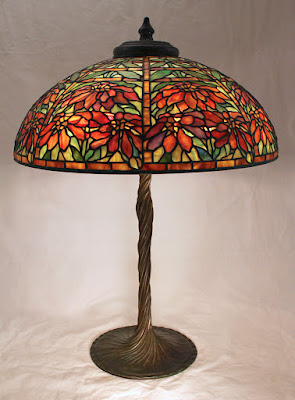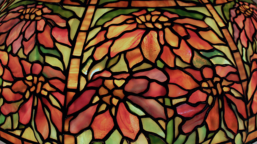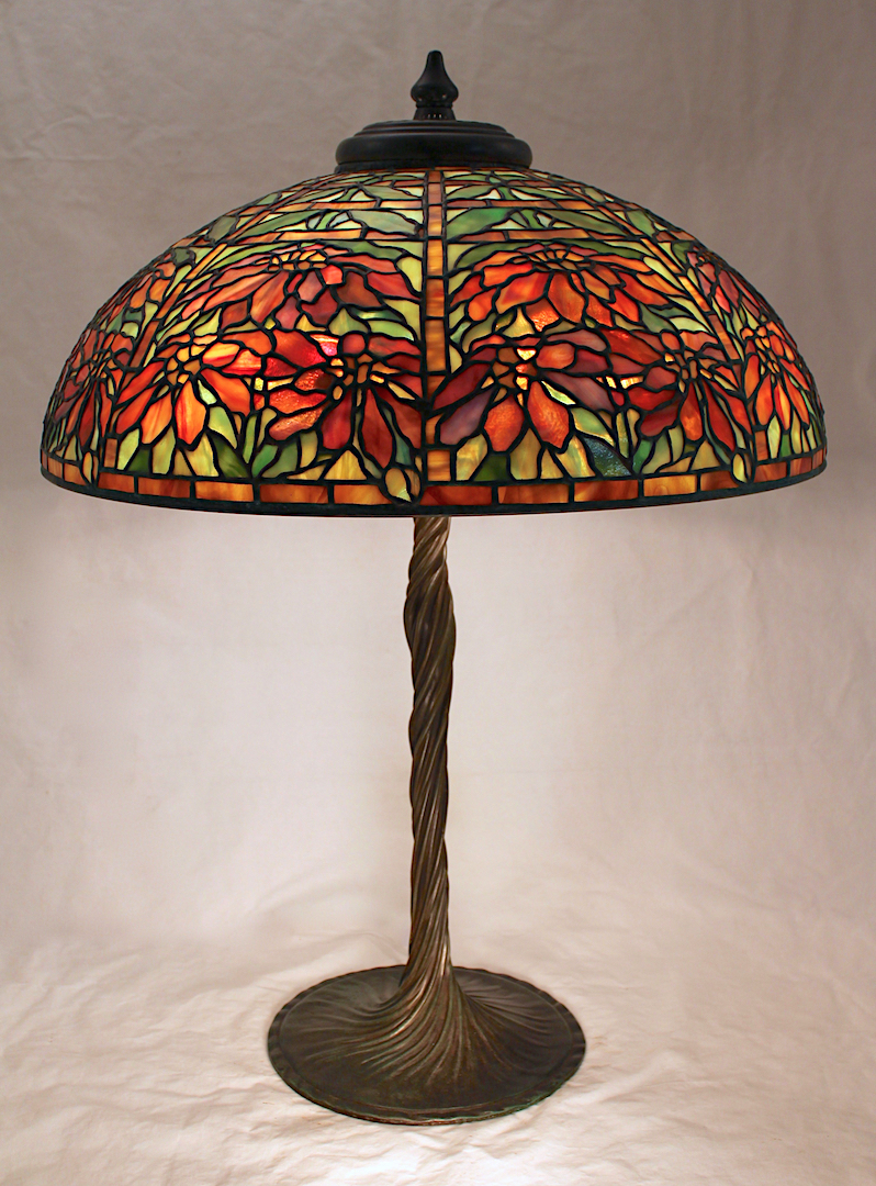 The 22″ Poinsettia shade showcases large expressive flowers blooming within a formal trellis. The tiered trellis creates windows through which the flowers expand. This shade design is often referred to as the Double Poinsettia.