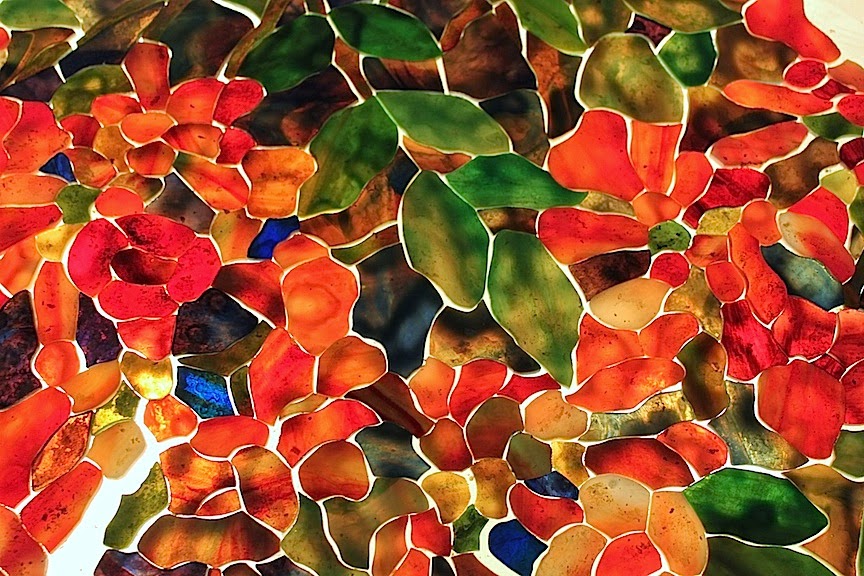 Large floral shades take quite a bit of time and planning to create. Much time was spent picking the glass and composing the layout. The Impressionistic coloration for this shade was achieved by digging deep into our library of glass, looking for just the right pieces to bring the shade to life.