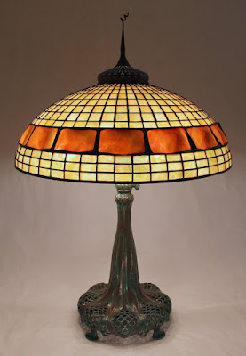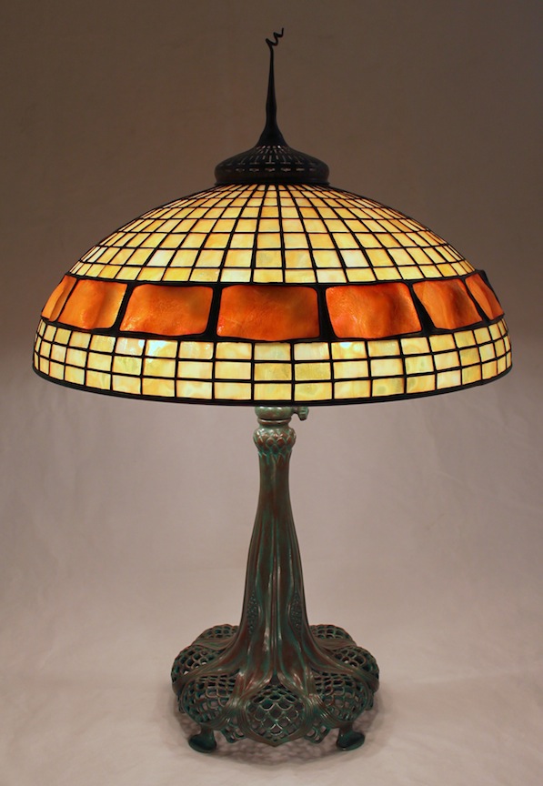 The 22″ Turtleback is an elegant Tiffany Studios shade design. For this example, the distinctive band of turtleback tiles is bookmarked by light amber/yellow upper and lower geometric sections. We had large deep orange/amber turtleback tiles created expressly for our studio, and from these, we hand cut and fit each tile for the band. Commissioned by a client in Maine, this impressive shade will be installed as an inverted chandelier. The 22″ Turtleback shade also makes an impressive table or floor lamp. We are also showing this shade on the Perforated base.