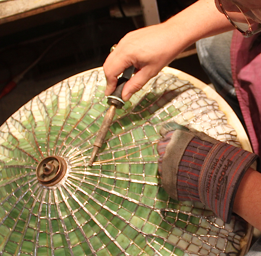 Soldering on a 25″ Mandarin Lotus shade takes quite a bit of time and patience. Due to the accordion pleat surface of the shade and the fact that 800 degree molten solder runs downhill, the shade must be constantly repositioned to ensure a proper bead line.