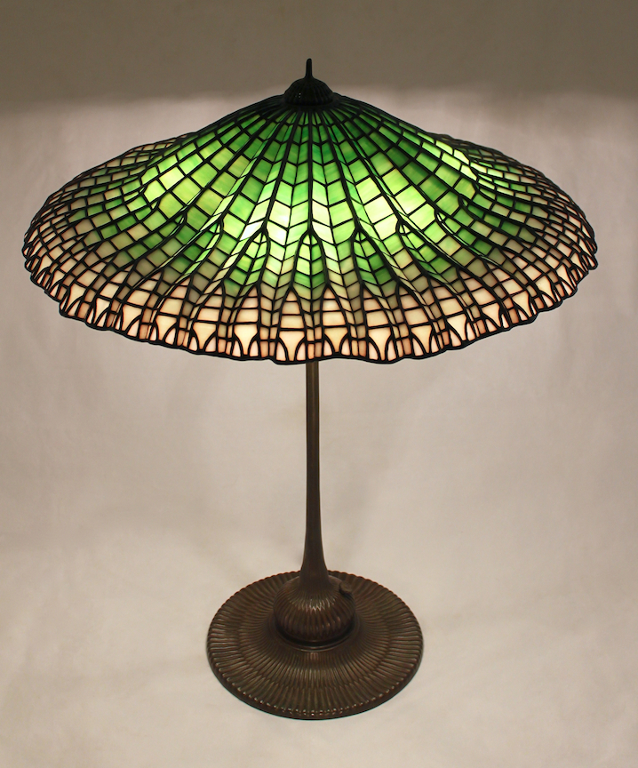 The completed shade was mated with the Mandarin Lotus base (or Ribbed Lotus base), which was specifically designed for this shade by Tiffany Studios. We create the base at Century Studios using molds taken from an original Tiffany example.