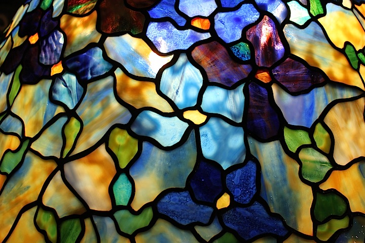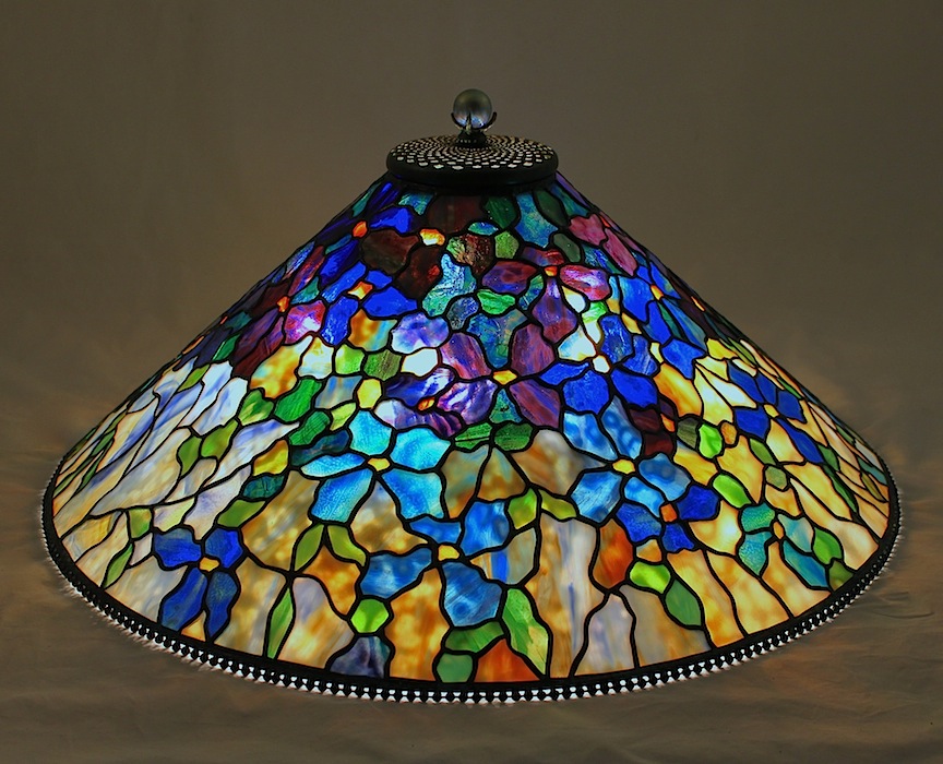 Large Tiffany floral shade patterns give the lamp artist the opportunity to showcase exceptional glass, and we have utilized many unique glasses by Lins, Schlitz and our own Century Studios’ hand rolled sheet glass for the flowers in this shade. Deep purples and blues contrast with the multicolored background colors, allowing us to showcase the exceptional hand rolled glass.