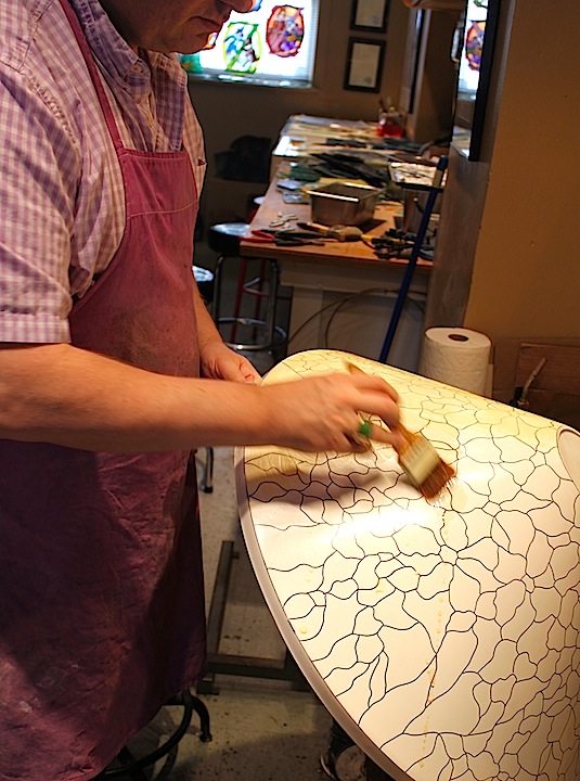 Irwin can be seen preparing the form with wax so the individual pieces can be transferred onto the form and soldering can begin on the shade. The shade is finished with a bead chain around the lower rim. We created this shade as a showroom piece and it is currently available for purchase in our showroom.