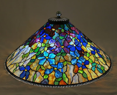 Century Studios is pleased to introduce a new shade to our reproduction Tiffany lamp offerings – the 28″ Clematis. This generously proportioned shade has a non-repeating design and, while it is usually intended as a chandelier fixture, it can also be used as a large table lamp or on a Junior Floor Base.
