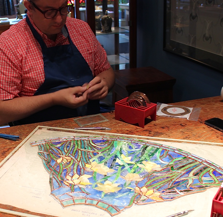 The overall feel of the shade is bright and cheerful. The background glass is a blended mix of blues, greens, and purples which start light and airy towards the top of the shade and intensify on the lower half. Over ten different greens were called into service to create the leaves and stems, and the yellow flowers are a lively mix of ring mottled, streaky, and textured glasses.