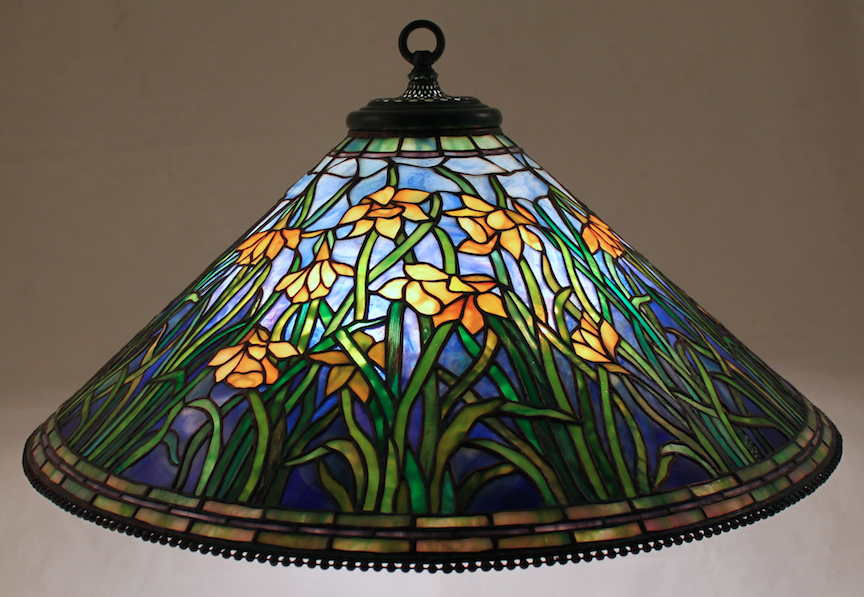 Large floral shades represent the finest stained glass shade designs created by Tiffany Studios. With their expanded surface area, the flowers on these shades definitely have room to grow! The 28″ Daffodil pattern has the natural look of a garden in springtime. The willowy stems hold the distinctive flower heads aloft while the slender leaves sway in a gentle breeze.