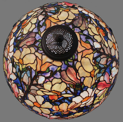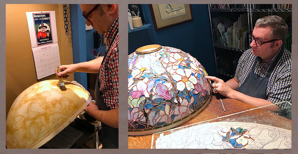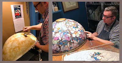 When the exterior of the shade has been completely soldered, heat is applied to melt the wax that is holding the shade onto the form. When hot, the form is removed from the shade. The interior of the shade is then completely soldered. For any shade larger than 20″ across, a network of reinforcing wires are permanently soldered in the interior. Large shades like this 28″ Magnolia will be extensively reinforced. The copper reinforcement wires are soldered in place following the lead lines so they are not visible when the shade is finished. Once the shade has been reinforced and the soldering finished, the shade is cleaned and prepared for patina. The leadlines on the completed shade are patinated to match the coloration on the base.