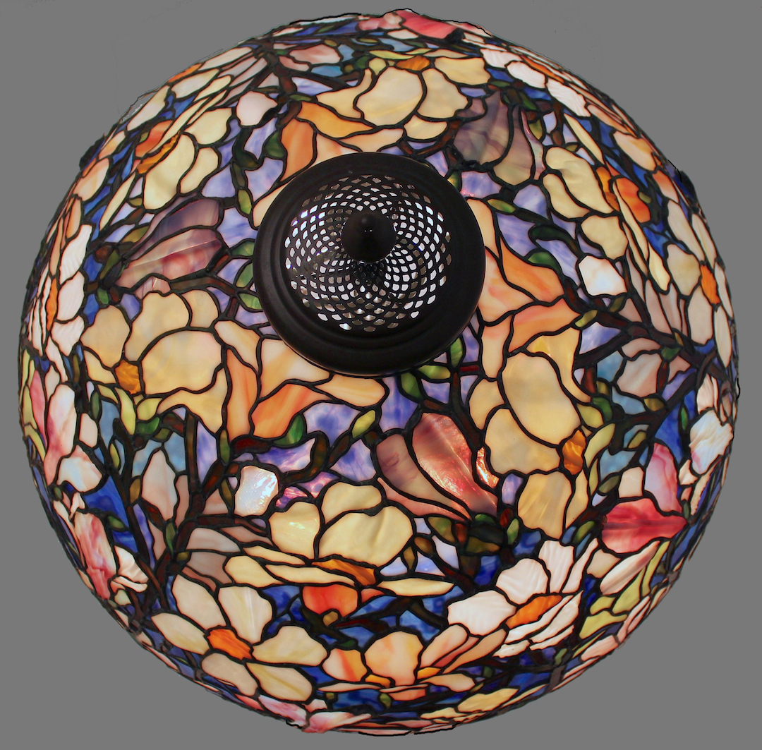The 28″ Magnolia is shown on the impressive Sr. Floor base in our showroom before being packed for shipping. This impressive lamp was commissioned by clients in North Carolina and now resides in their home.