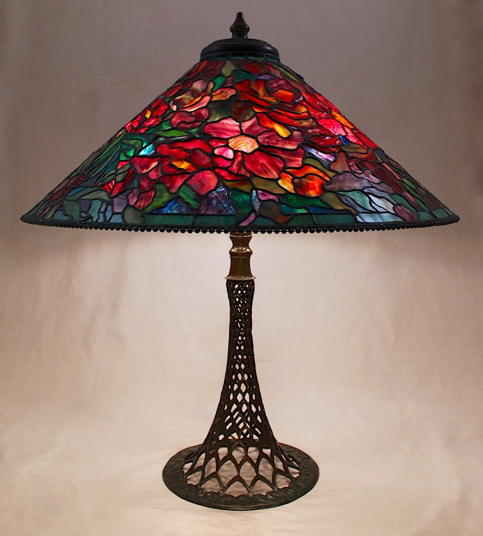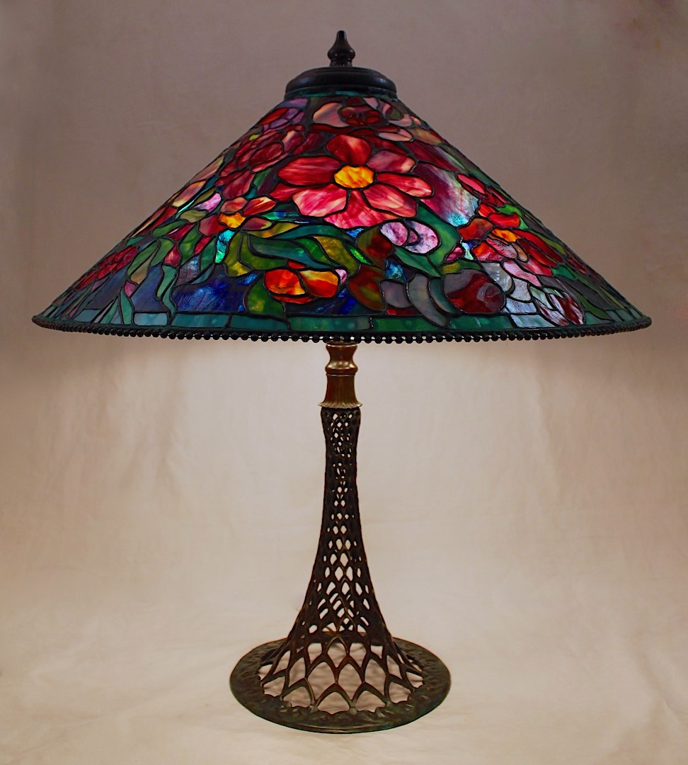 At Tiffany Studios, lamps were designed to bring the excitement of stained glass windows off the walls and into the room – while still performing the functional service of providing light. The 28″ cone shaped shades were intended as large chandelier fixtures that would be the focal point of any space they occupied. Most of these designs have patterns that flow across the entire surface of the shade with no pattern repeats. This inspires the lamp artist to respond to the changes in the design, searching out the choicest glasses and using them boldly.