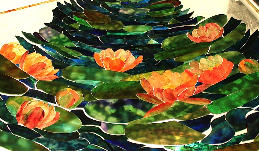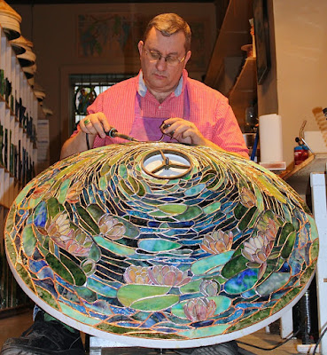 We have been preparing to create the 36″ Pond Lily for close to a year – searching out glasses, having special lamp parts created, and generally discussing the construction and layout for the shade. This is not a design to rush into, as it takes some plotting and planning to help the construction run smoothly.