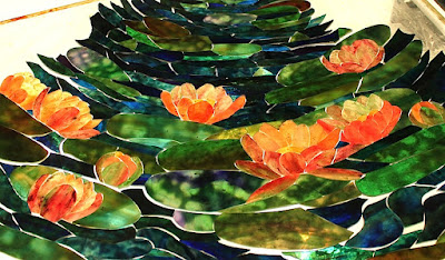 To bring the pattern alive, a variety of blue, purple, and green glasses were blended together for the water portion of the shade. The combination of smooth and rippled glasses will give the effect of breezes ruffling the surface of the pond. Lily pads and water lilies dot the surface of the shade, and much care was taken to select interesting glasses for the water plants. Once Irwin completed the glass selection for the shade, Bill began the foiling (while Irwin was soldering the geometric shades).
