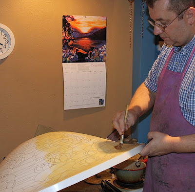The foiling completed, the form was waxes with our special, house made “tacky wax”. This beeswax concoction allows us to hold the foiled pieces of glass onto the form for soldering. Once transferred, the process of soldering the shade was begun, and is continuing at this time! As you can see in the photo below, this is a shade that cannot be completed in a hurry. We will show the rest of the process and completed shade in a future post.
