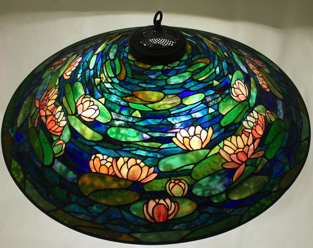 We finished off 2015 by completing the 36″ Pond Lily shade for our showroom. This unusual Tiffany Studios shade pattern is a new design for our studio. While water themed shades were popular motifs for Tiffany Studios, there are only two known original examples of this shade.