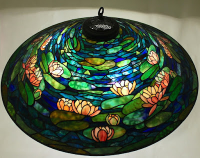 The generous size and strong horizontal lines of the design give the viewer the impression of being near a tranquil pond in summer. Water lilies in varying shades of white, pink, and yellow dot the surface of this unusually shaped shade. The multicolored water areas were achieved by the skillful combination of color and texture, bringing the sparkling pond to life. This shade is currently available in our showroom and is displayed as a chandelier fixture.