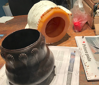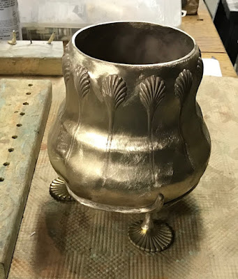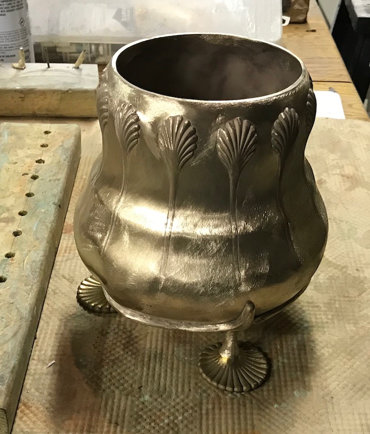 Once cooled to room temperature, the ceramic shell is broken to reveal a raw bronze. Each wax makes one bronze, so if there is a flaw in the shell, the entire process must be restarted from the beginning. The bronze is then chased (cleaned up) by Dan, the person in charge of metal finishing and fabrication at the foundry. To create the Shell Urn base shown above, four castings are needed – each foot is cast individually and the body is a separate casting. Dan attaches the feet to the casting and it is ready to return to our studio for us to complete.