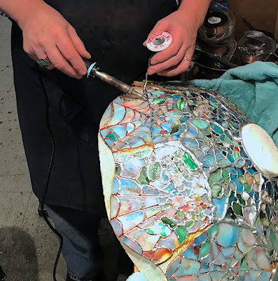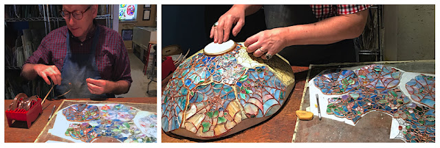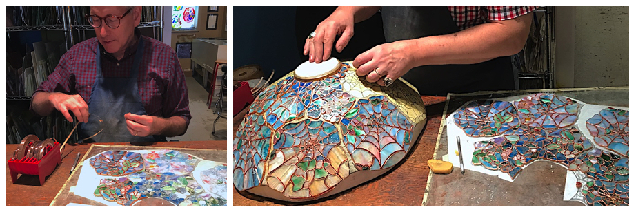 Once the glass was cut and fit to the pattern, the pieces were foiled by hand and then transferred onto the waxed form.