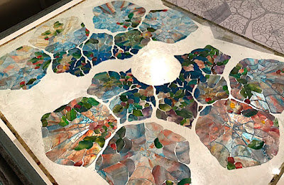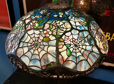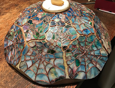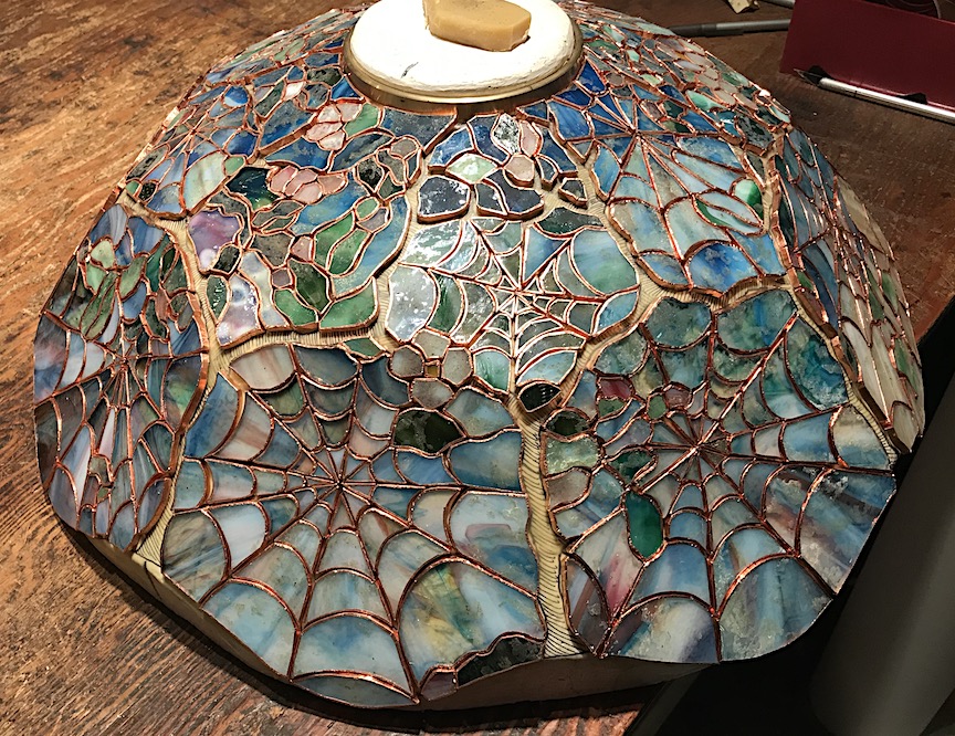 After completing the pattern work for the shade and pictorial mosaic for the base, we were able to begin construction on the 20″ Cobweb shade. Studying original Tiffany Studios examples in books, on line, and in person, we came to realize that there were two basic color schemes used in the eight or nine examples that exist. The first style is to use a completely transparent, textured clear crackle glass for the background. The Cobweb Mosaic lamp was originally conceived as an oil lamp, so the transparent glass made sense. With the widespread advent of electricity, the clear crackle glass was too transparent, and other examples of this lamp were created using glass that, while still transparent, has the addition of filamented color in the webs. After discussion with our client, we decided upon a semi-transparent glass for the shade that would have lots of sparkle and color, but not be completely clear.