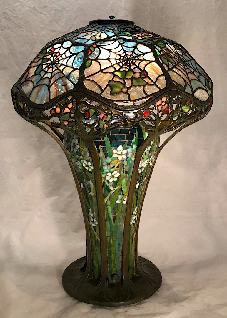 Along with the Wisteria, Dragonfly, and Magnolia lamps, the 20″ Cobweb Mosaic lamp (29″ tall) is one of Tiffany Studios signature lamp designs. Each element of this visually stunning lamp blends together creating a three dimensional painting in glass and bronze.